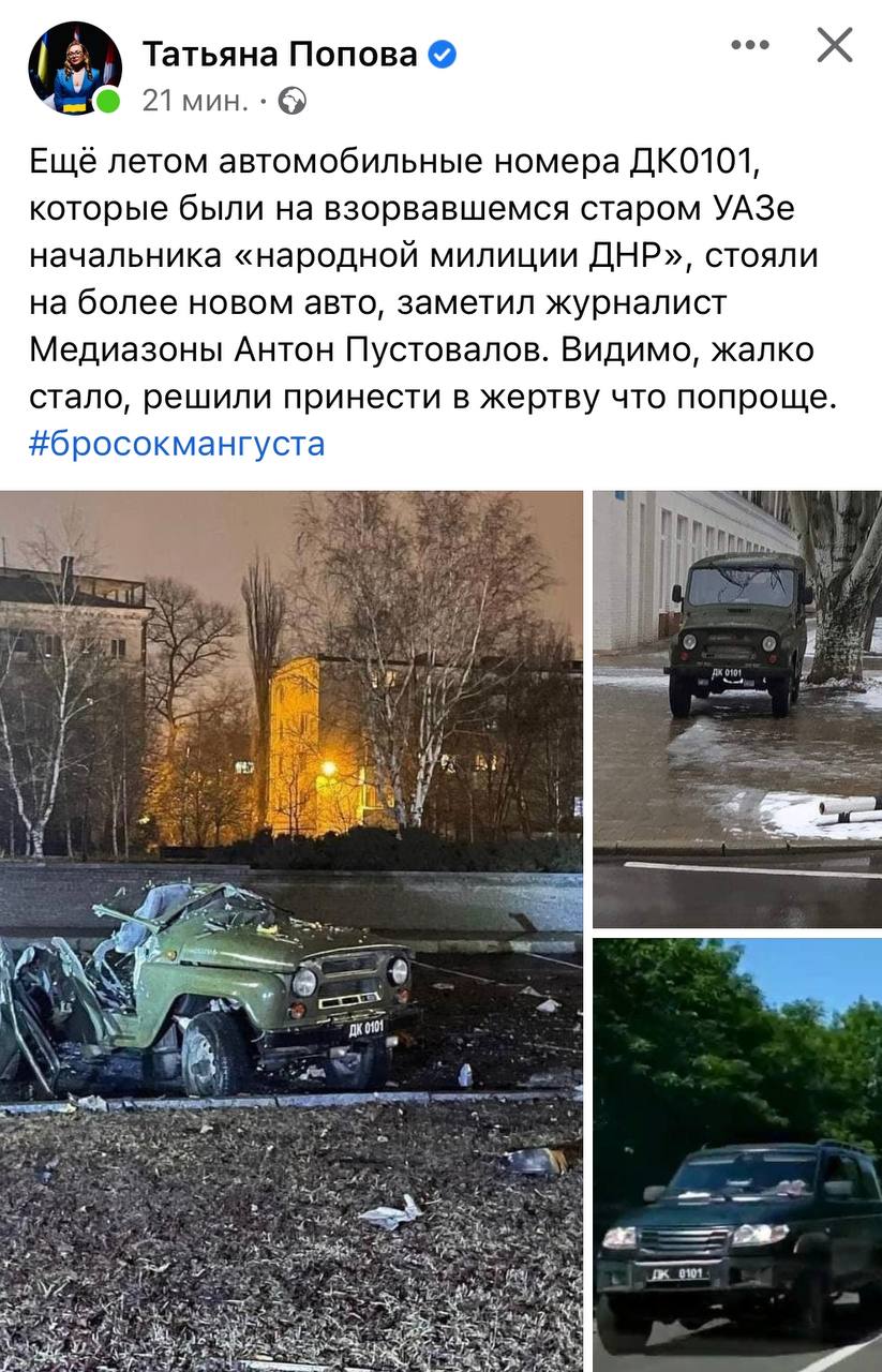 Еще одно доказательство того, что Россия искусственно нагнетает ситуацию на Донбассе. Так, накануне в центре Донецка был подорван автомобиль УАЗ «бобик», но, как оказалось, еще недавно это номер стоял на более современном автомобиле. То есть в жертву принесли совсем никому ненужный металлолом, совершив его подрыв.