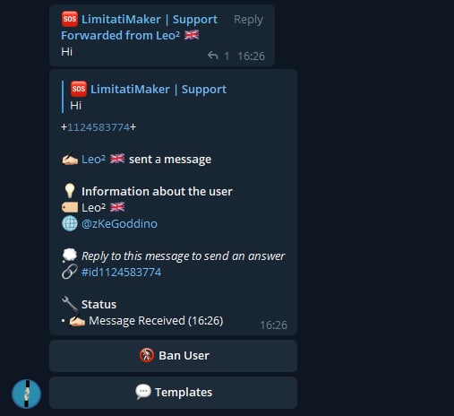Acquistando il supporto custom vi verrà data la possibilità di collegare il vostro bot ad un gruppo, per poter rispondere, inviare templates e bannare utenti direttamente da quest'ultimo!
