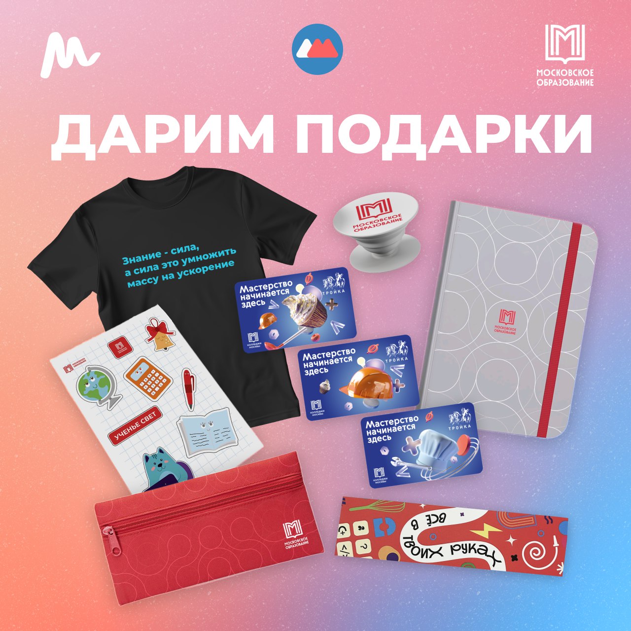 🎁 футболку «Знание — сила», пенал с канцелярией, скетчбук, наклейки, попсокет, карту «Тройка» и закладку для книги