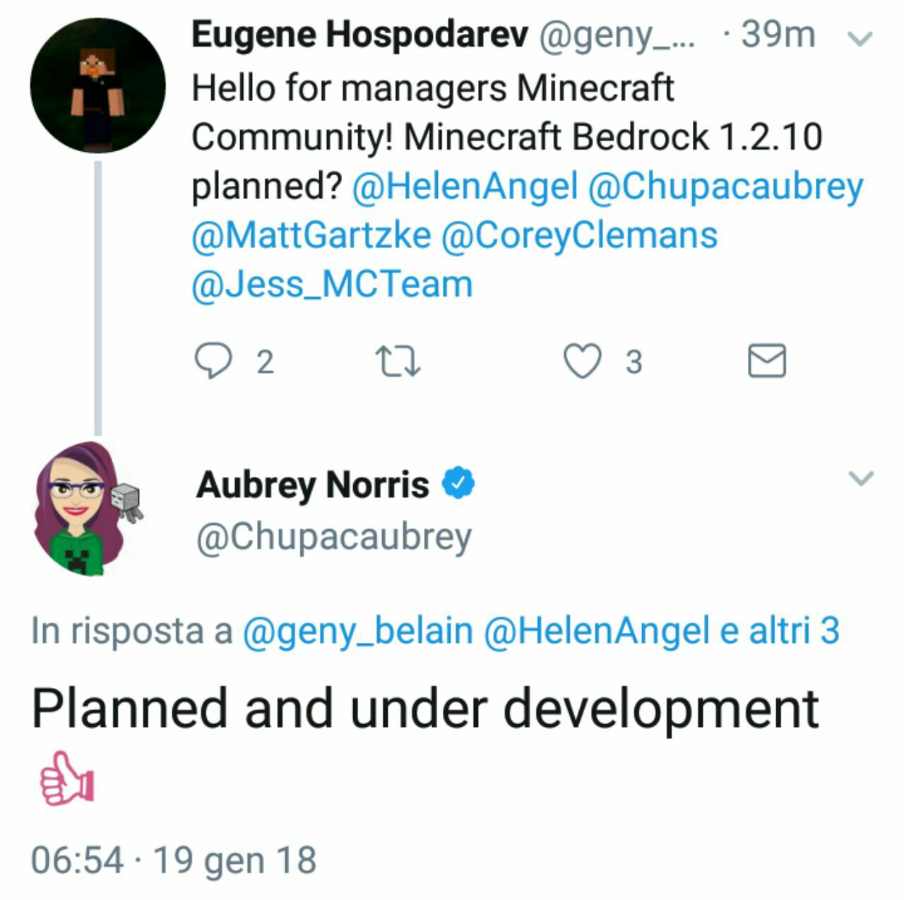 Su Twitter una coordinatrice della community di Minecraft Bedrock ha confermato che la 1.2.10 é pianificata e in sviluppo. Nel mentre degli sviluppatori hanno annunciato durante una diretta che anche la 1.2.11 é stata pianificata!
