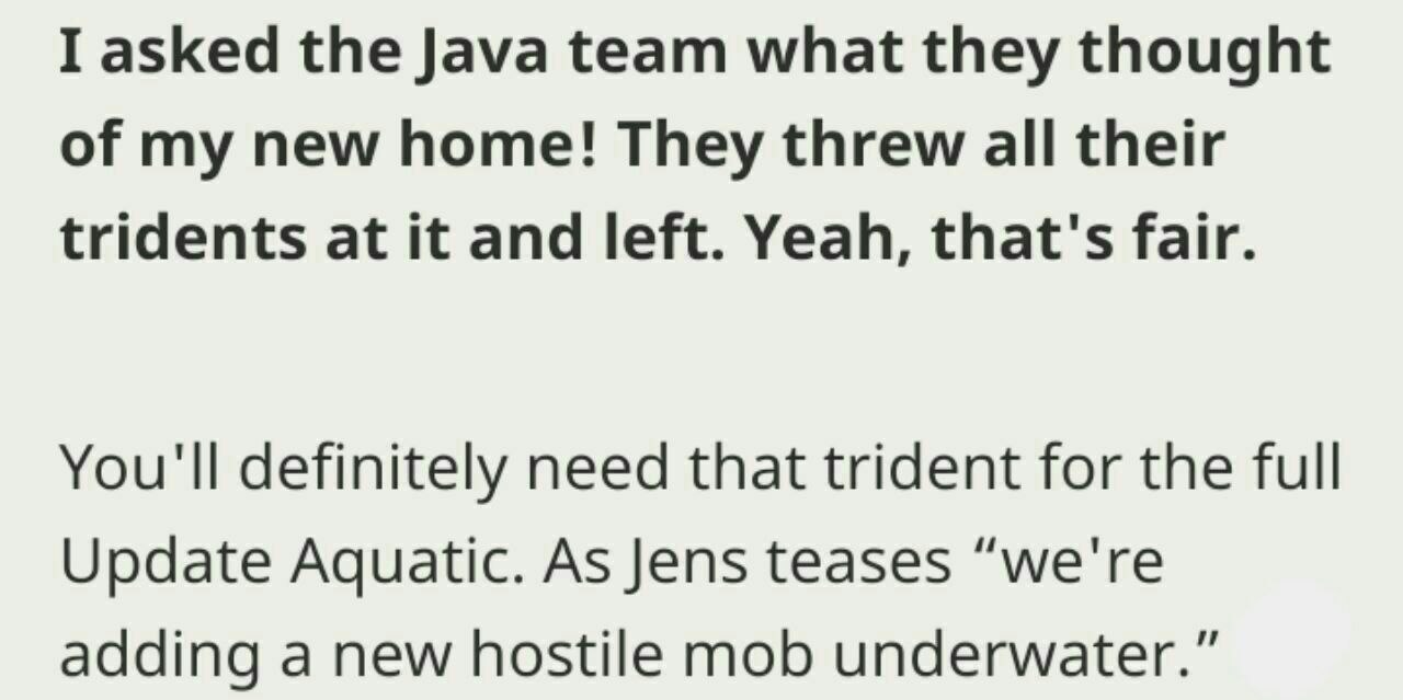 In un post di Minecraft, Jeb annuncia che nell'Aggiornamento Acquatico sarà presente anche un nuovo mob ostile marino! Probabilmente questo nuovo mob arriverà tra uno o due snapshot nella versione Java e un pò più tardi anche su Minecraft Bedrock!