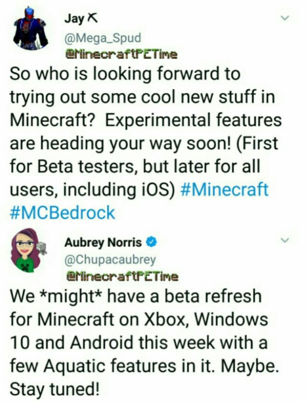 Lo sviluppatore "Jay" del Team di Minecraft Bedrock scrive su Twitter che tra poco usciranno delle Beta che contengono delle nuove funzionalità sperimentali! Inoltre stanno anche pianificando di poter rilasciare delle versioni beta pure su iOS.