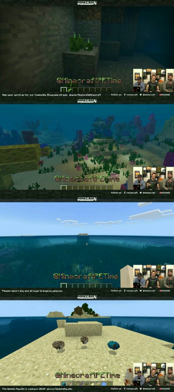 Nella diretta ufficiale di questa sera fatta da alcuni sviluppatori di Minecraft Bedrock hanno mostrato alcune delle nuove funzionalità in arrivo nella prossima beta che uscirà tra oggi e domani. Le funzionalità mostrate sono i nuovi colori dell'acqua che assumono in base al bioma in cui ci si trova e visuale meno sfocata sott'acqua, il nuovo meccanismo dell'ossigeno che non si rigenererà più instantaneamente appena si uscirà dall'acqua, la possibilità di nuotare negli spazi 1×1, le nuove texture dell'acqua e delle alghe, le rovine sottomarine, i cetrioli di mare, il Nautilus e un nuovo oggetto chiamato "Cuore del Mare" (in basso a destra nell'ultima foto)!