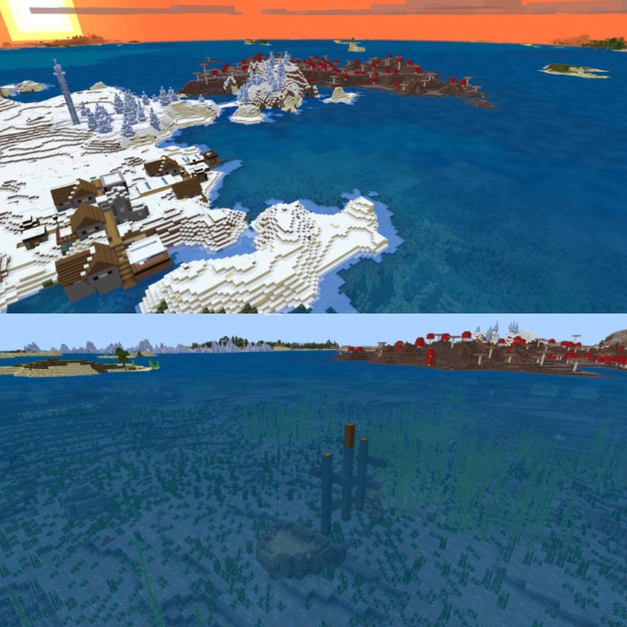 Questo Γ¨ un seed molto interessante, dove spawnerai in una isoletta piena di canne da zucchero. Proprio vicino si trova la rarissima isola dei Funghi e alle sue spalle troverai delle picche ghiacciate e un villaggio.