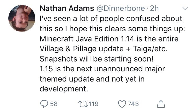Dinnerbone su Twitter tende a precisare che tutte le novità annunciate durante il Minecon Earth e le novità della Taiga riguardano solamente un aggiornamento, ovvero il “Village&Pillage” e che la 1.15 non è ancora in sviluppo e non ha ancora un tema. Inoltre, gli Snapshots della 1.14 arriveranno tra non molto per la Java Edition!