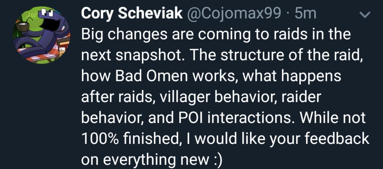 Nel prossimo snapshot saranno presenti dei grossi cambiamenti ai Raid, al funzionamento del Bad Omen, al comportamento dei Villager e dei Saccheggiatori. Queste funzioni non sono ancora complete e per questo Cojomax invita a lasciare un feedback in modo da migliorarle il più possibile.