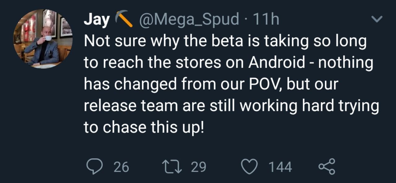A quanto sembra ci sono stati dei problemi con il rilascio della beta 1.13 su Android. Gli sviluppatori, per quanto siano oscuri al problema, stanno ancora lavorando per far uscire la beta il più presto possibile. Non appena sarà disponibile vi avviseremo sul canale.