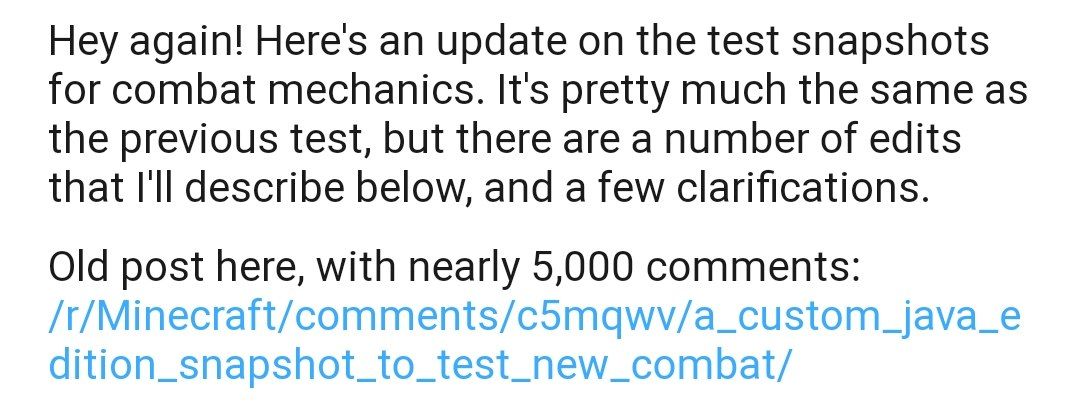 « Le meccaniche di combattimento sono state un argomento controverso sin dall'aggiornamento 1.9 e vogliamo che siano le stesse per entrambe le edizioni. Il porting ci ha preso molto tempo e per questo il pvp è completamento diverso tra Java, che risulta lento, poco eccitante e molto complicato da comprendere, e Bedrock, che, invece, è molto complicato su controller, le armi sono pressoché simili e le armature non sono bilanciate. Con il vostro feedback cercheremo di trovare un sistema divertente e funzionale per entrambi le edizioni. »