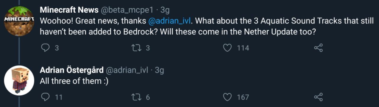 È stato confermato che, oltre alle 4 nuove tracce musicali nei biomi del Nether, verranno finalmente aggiunte le 3 tracce degli oceani, che fino a questo momento non erano presenti nella Bedrock.