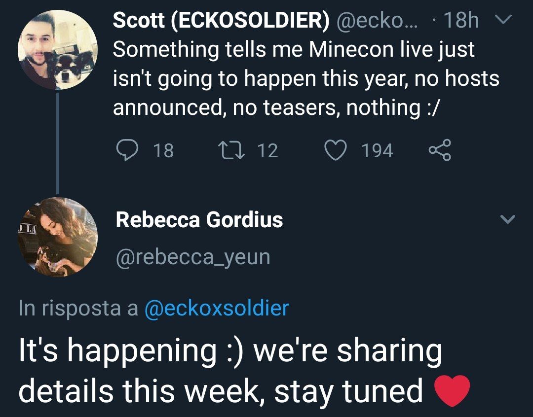 Il Minecon Live 2020 è stato annunciato e sarà trasmesso in live streaming il 3 Ottobre. Per maggiori info visitate la pagina apposita sul sito ufficiale.