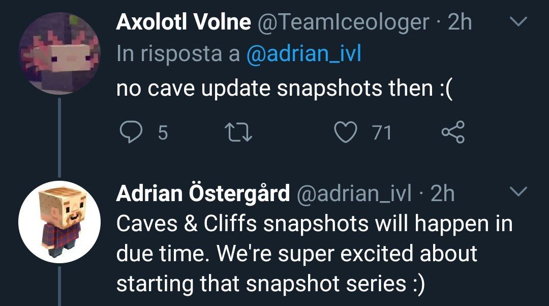 Lo sviluppatore Adrian ha affermato che gli snapshot della 1.17 arriveranno a "tempo debito" e quindi fa pensare che non arriveranno nel breve periodo.