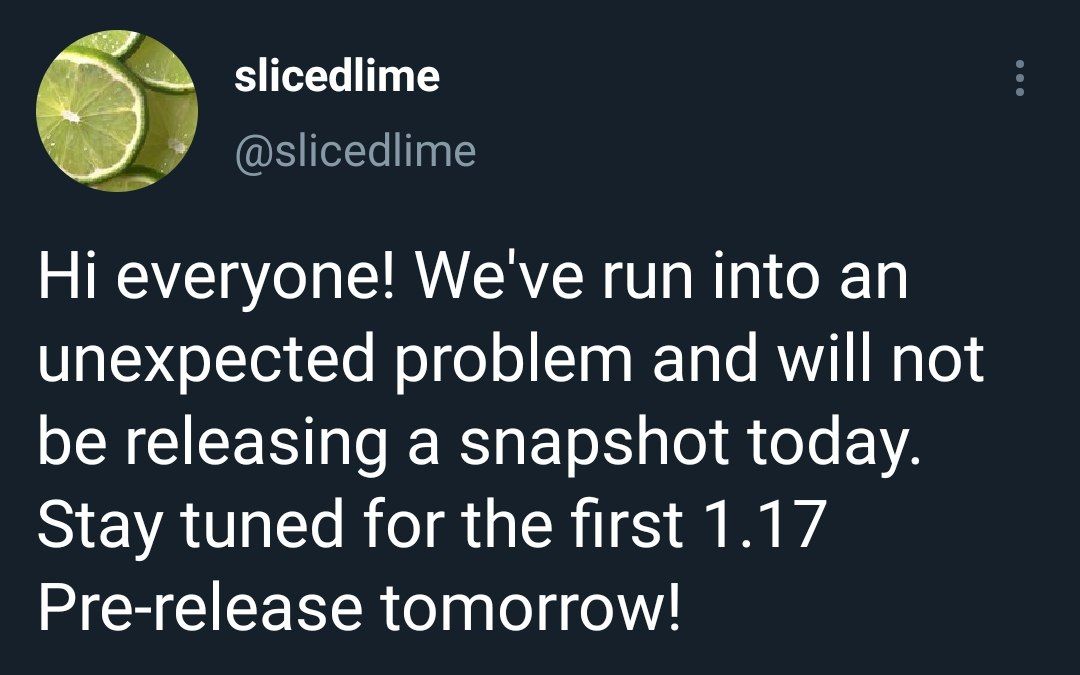 È stato annunciato che per un problema oggi non uscirà alcuno snapshot per la Java, mentre domani ci sarà il rilascio della 1ª pre-release della 1.17!