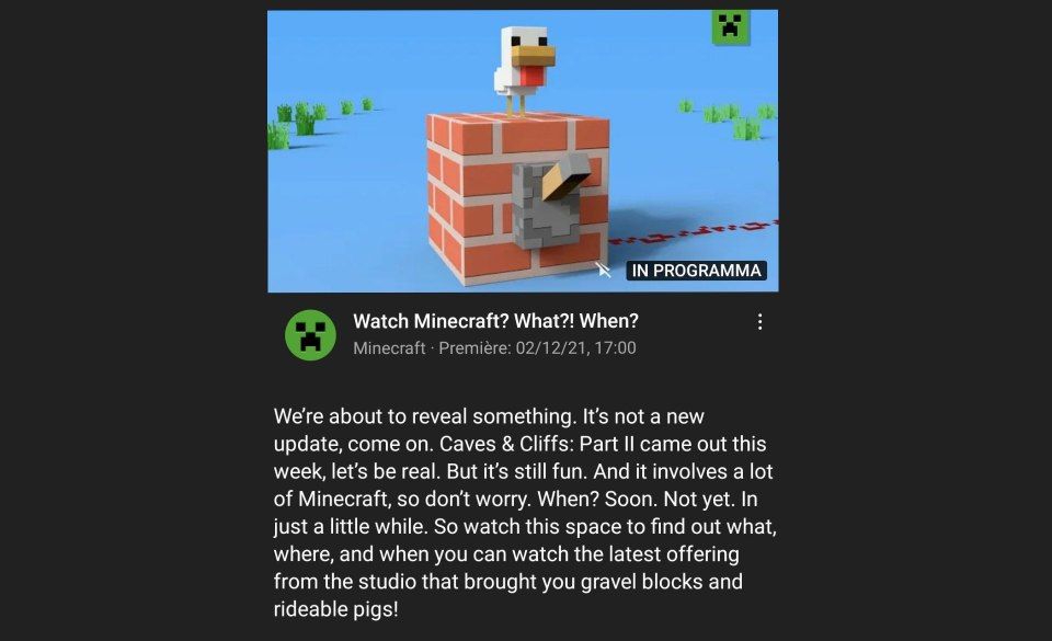 Tra meno di 3 ore inizierà una première sul canale YouTube di Minecraft, dove, presumibilmente, sveleranno un nuovo progetto. Forse sarà un annuncio legato a nuovo gioco o al tanto anticipato film, ma lo sapremo soltanto tra qualche ora!