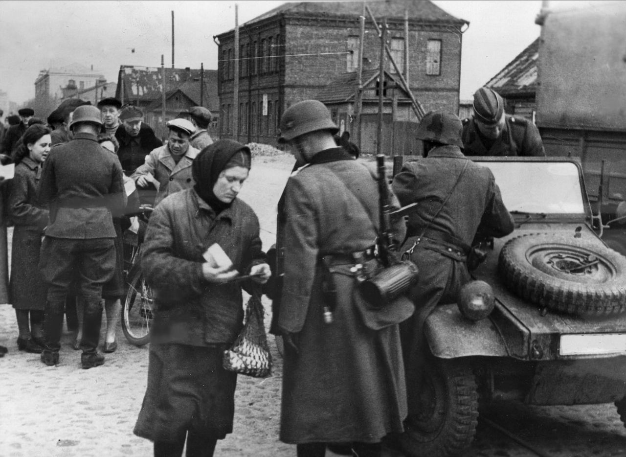 На фото - немецкая полевая жандармерия проверяет документы на улице оккупированного Минска, 1943 г.