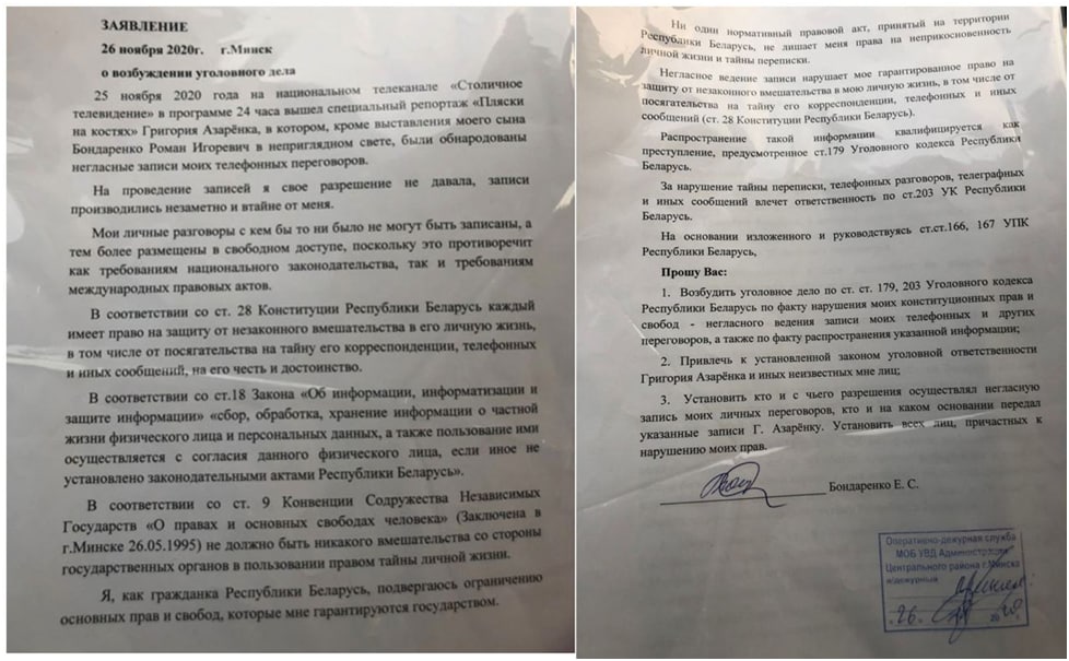 Мать погибшего Елена Бондаренко написала заявление в Центральный РОВД Минска. Она считает нарушением статьи 28 Конституции Беларуси, статьи 18 закона «Об информации, информатизации и защите информации» и статьи 9 Конвенции Содружества Независимых Государств о правах и основных свободах человека организацию прослушки, запись ее телефонных разговоров и их публикацию в телеэфире. Заявительница просит возбудить уголовное дело по факту нарушения конституционных прав и свобод, привлечь к уголовной ответственности журналиста Григория Азарёнка и иных неизвестных лиц, а также установить, кто и с чьего разрешения осуществлял негласную запись личных переговоров и на каком основании передал записи Азарёнку.