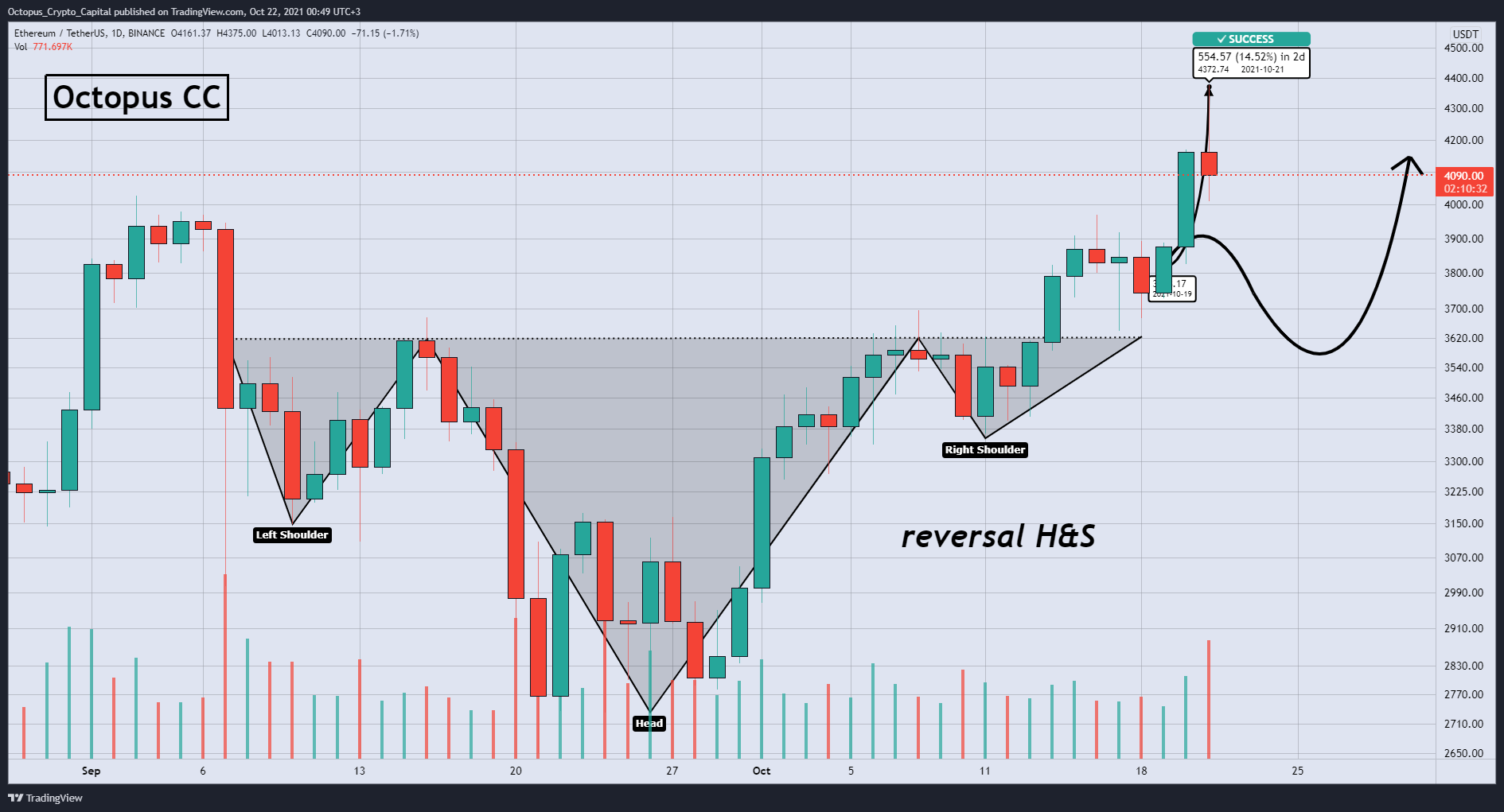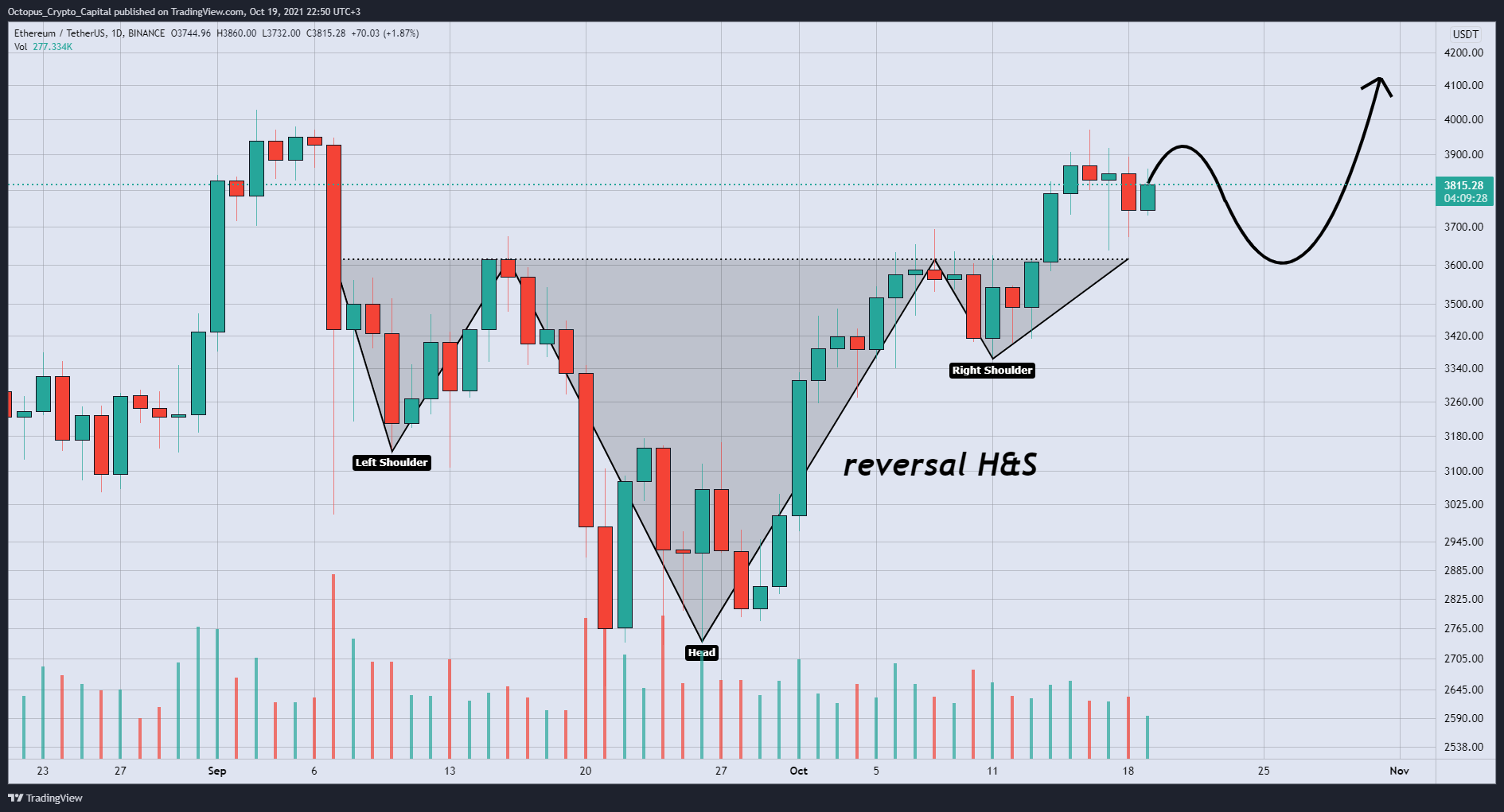Let's consider the situation on the daily timeframe. We see that the price is starting to rise according to the reversal head & shoulders pattern. Given that altcoins are slightly behind BTC, we expect growth.