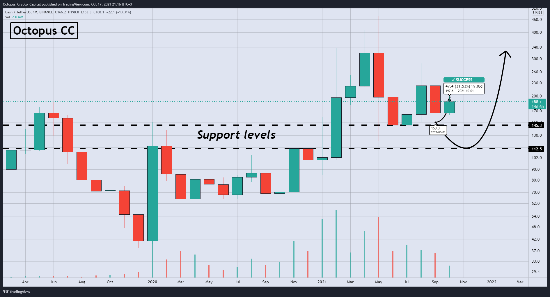 DASH/USD Analysis Let's examine the situation on the timeframe of one month. We see that the price approaches two important support levels around 112 and 145. From here it is very likely to start rising. #Technicalanalysis
