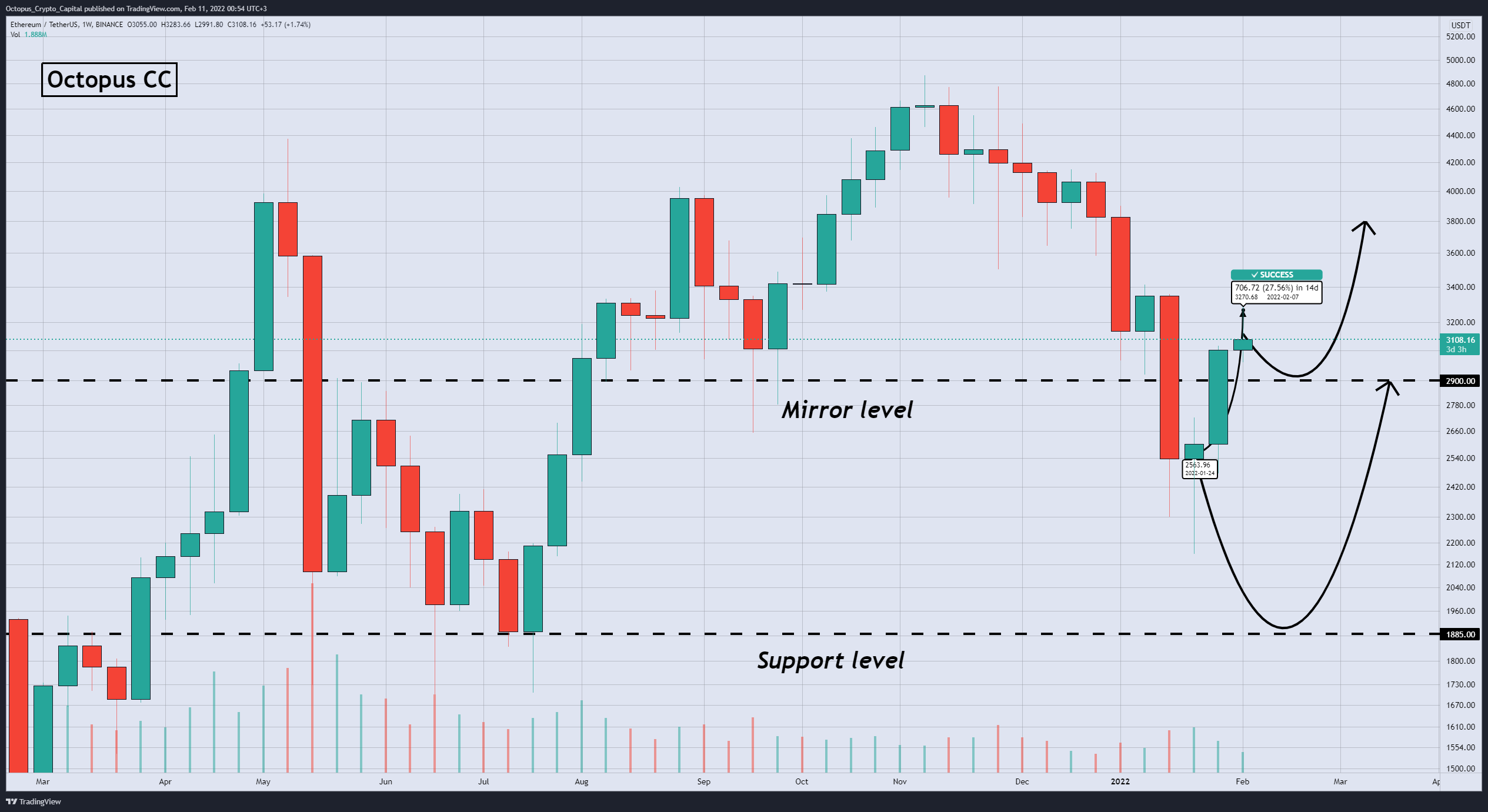 Let's look at the 1 week timeframe again. As we predicted, the price went up, overcoming the mirror level. We expect the growth to continue on the momentum. Again, a retest of the mirror level may occur.