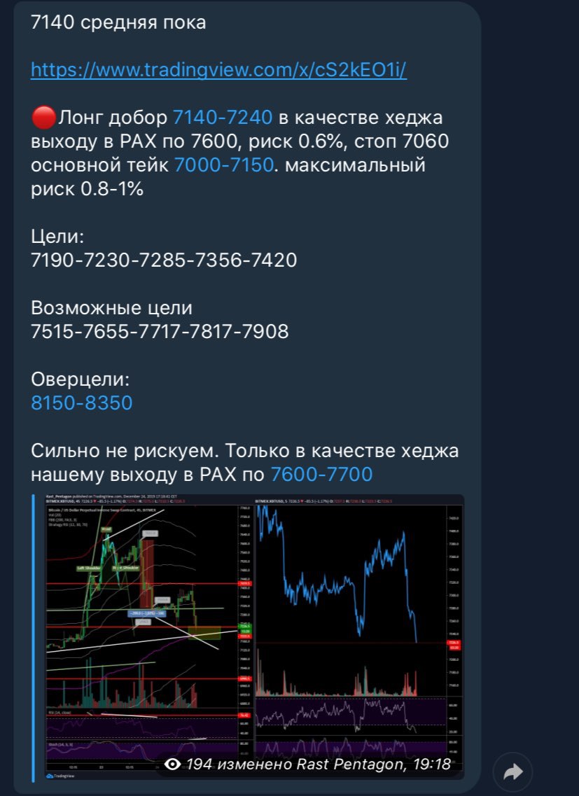 В качестве хедж-позиции нашему лонгу от 6890, мной и бойцами был взят скальп-шорт в диапазоне 7580-7640. Моя средняя 7612. Я закрыл 65% на тейке 7389 и остаток висит в прибыльном БУ , а это больше 210 пунктов профита! Остальные тейки на скрине! Поздравляю…