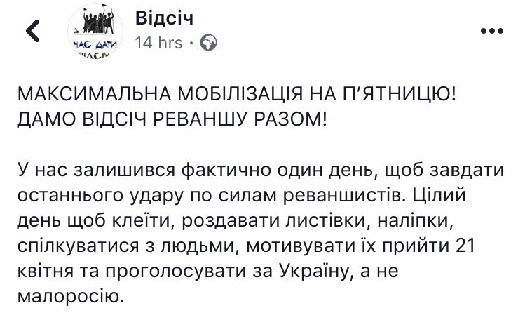 У нас залишився фактично один день, щоб завдати останнього удару по силам реваншистів. Цілий день щоб клеїти, роздавати листівки, наліпки, спілкуватися з людьми, мотивувати їх прийти 21 квітня та проголосувати за Україну, а не малоросію.
