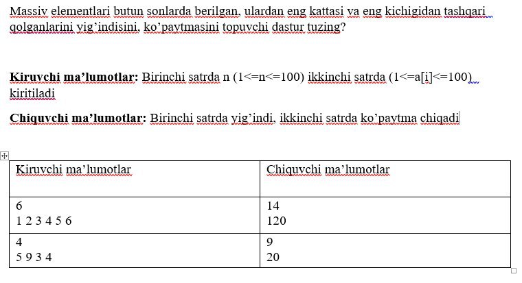 Massiv elementlari butun sonlarda berilgan, ulardan eng kattasi va eng kichigidan tashqari qolganlarini yig’indisini, ko’paytmasini topuvchi dastur tuzing?