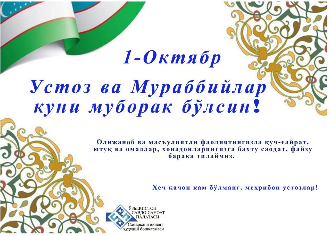 Жамиятимизда фаол ва фидойи, баркамол авлодга таълим-тарбия бериш, интеллектуал салоҳиятли ёшларни вояга етказишга ўз ҳиссасини қўшиб келаётган сиз азиз устозларни бугунги қутлуғ айём Ўқитувчи ва мураббийлар куни билан самимий муборакбод этаман.