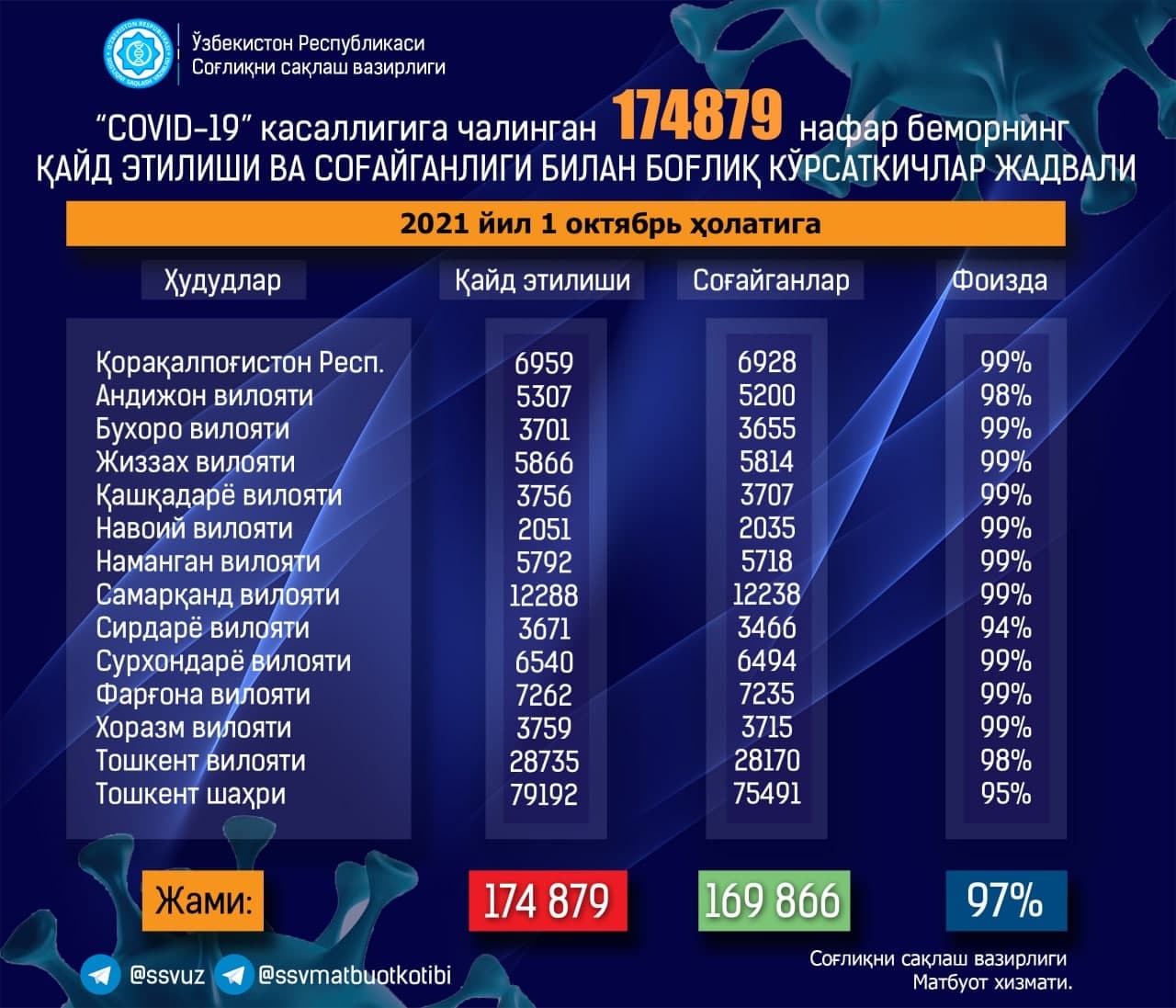 🔺2021 yil 1 oktabr holatiga ko‘ra, O‘zbekistonda koronavirus infeksiyasi qayd etilganlar soni 174879 (+471) nafarni tashkil etmoqda.