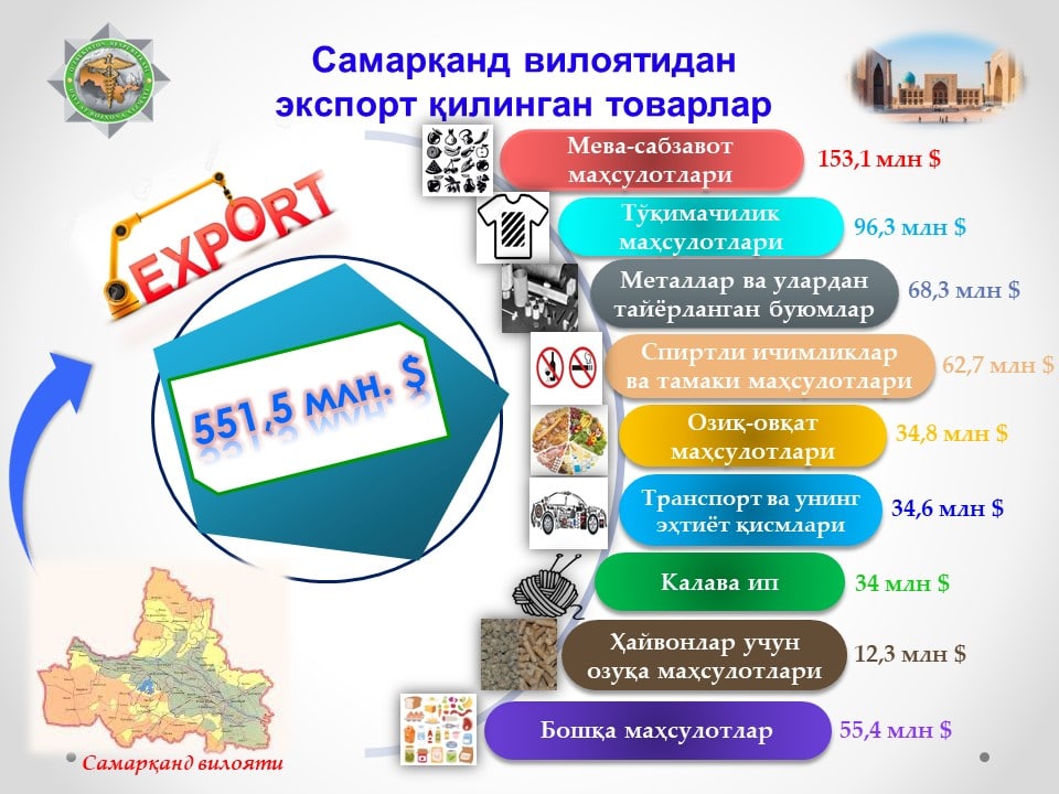 📊 2022 йилнинг 11 ойи давомида Самарқанд вилояти божхона бошқармаси томонидан 551,5 млн. АҚШ доллари миқдорида товарларнинг экспорт божхона режимига расмийлаштируви амалга оширилди.