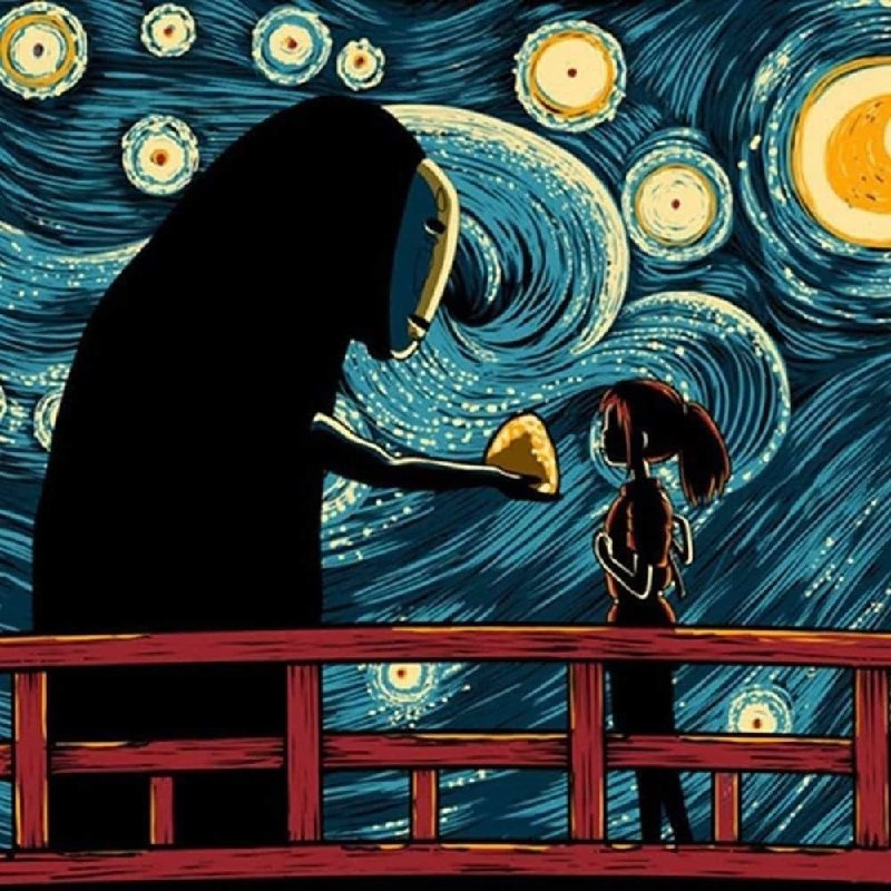 На фото стилизованное под Ван Гога изображение кадра из мульта «Унесённые призраками» студии Ghibli.