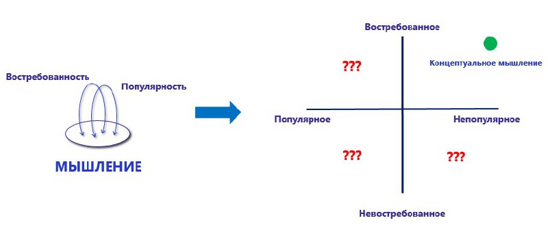 Есть мышление стратегическое, системное, аналитическое, концептуальное и т.д. Если составить схему из множества МЫШЛЕНИЕ и отношений востребованности и популярности, то получим вот такую матрицу (фото). Её надо заполнить видами мышлений и определять уже востребованность и популярность сегодня или в будущем.