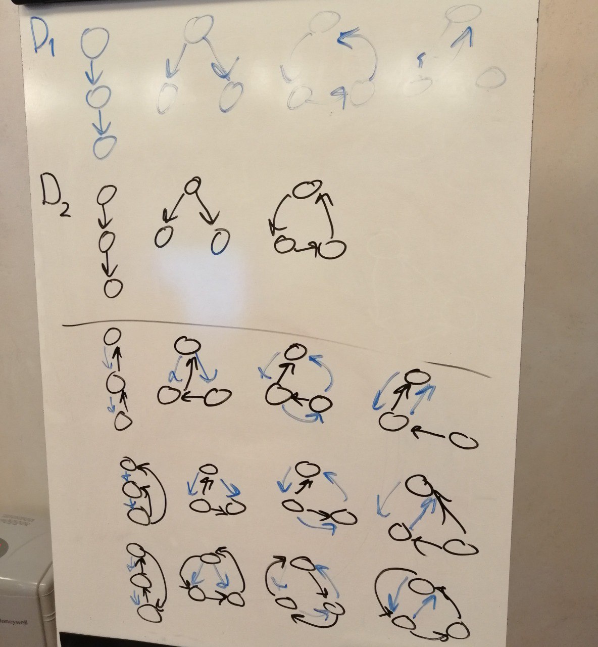 Потом рисовали некоторые варианты таких схем. Они на фото. Условно синим показаны варианты товарных отношений, а чёрным денежных. Например, слева синяя сверху схема один передаёт другому, тот передаёт третьему. Эту схему можно назвать посредничеством. Есть когда один передаёт нескольким (условное спонсорство) и т.д.