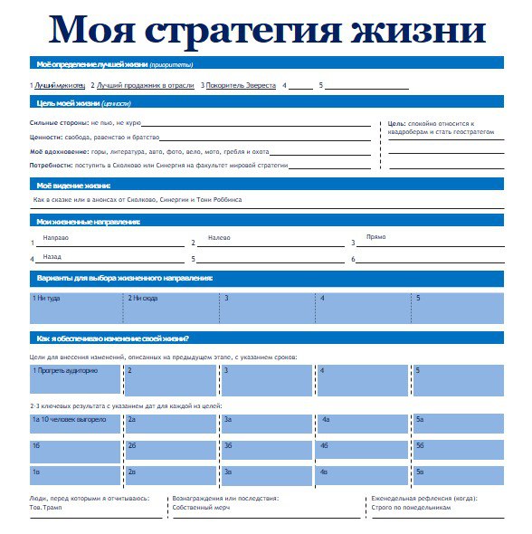 Что понравилось у консультантов, так это оформление личной стратегии на одном листе (примерно, как на фото). Форма нормальная, а вот содержание нет. Минус такой разработки личной стратегии от консультантов ещё и в том, что потенциал человека не определяется и не задействуется. Упор делается на «хотелки» от бенчмаркинга других людей. Про развитие человека у консультантов тоже особо ничего нет. Возможно, бенчмаркинг и есть развитие для человека🤷♂️.
