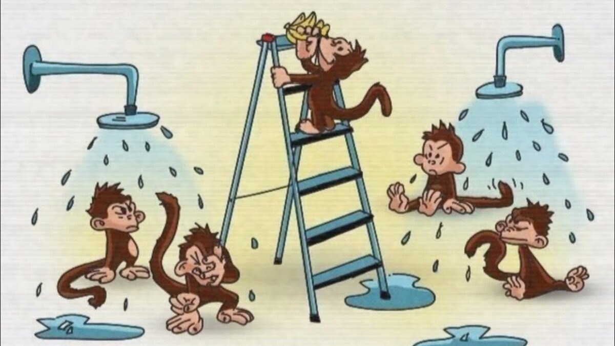 В эксперименте участвовали 5 шимпанзе, находившихся в одной клетке. К потолку клетки была подвешена связка бананов. Когда одна из обезьян попыталась дотянуться до бананов, всех обезьян обрызгали холодной водой. Когда вторая обезьяна также попыталась дотянуться до бананов, всех обезьян обрызгали ещё раз. После нескольких попыток обезьяны начали саморегулироваться друг с другом, проявляя агрессию по отношению к любому шимпанзе, который пытался забрать бананы.