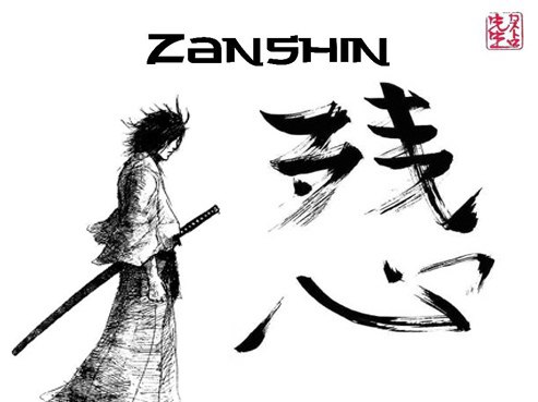 Дзаншин - полная сосредоточенность на внешнем, на том, что происходит на самом деле, а не в твоём воображении, на твоих мысленных "полях сражения". Если ничего не происходит, ничего не надо делать - стой спокойно и наблюдай. В картинах о самураях мы видели такие странные сцены долгого разглядывания противников в застывшей позе. Это - дзаншин. У котов есть похожая боевая техника - нападение взглядом. Пока противник не кинется наутёк, за ним не бежит его соперник.