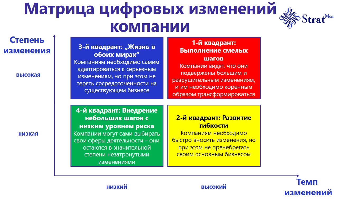 Показанная матрица определяется масштабом и скоростью цифровых изменений, которые необходимо освоить внутри компании. Дальнейшие приоритеты вашей цифровой трансформации должны определяться позиционированием вашей компании в этой матрице задач.