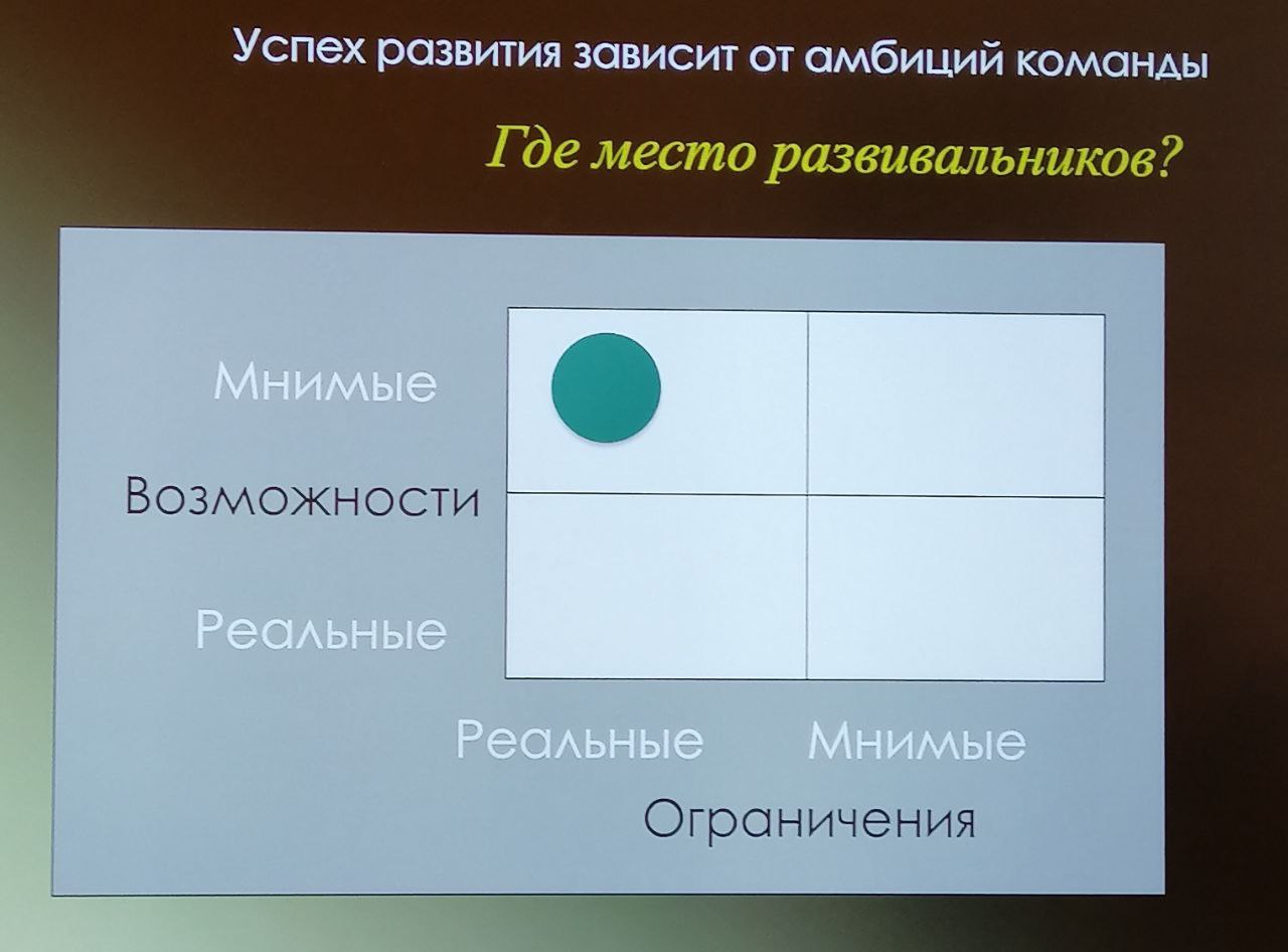 В малых компаниях на начальных этапах для человека, занимающимся развитием, достаточно и домыслительного уровня, уровня ребёнка. Вот в стартапах уже требуется минимум философский уровень, уровень взрослого. В больших же компаниях, имеющих штатного директора по развитию, ему уже требуется концептуальный уровень мышления, уровень умудрённого годами взрослого.