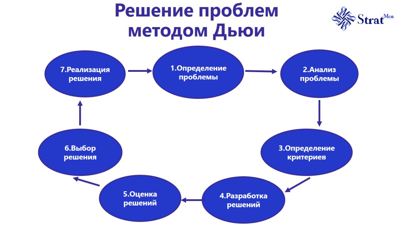 Одним из наиболее эффективных методов решения проблем является метод Дьюи. Этот метод использует процесс рефлексивного мышления, который представляет собой структурированную серию вопросов. Этот процесс описан в вопросах, перечисленных ниже.