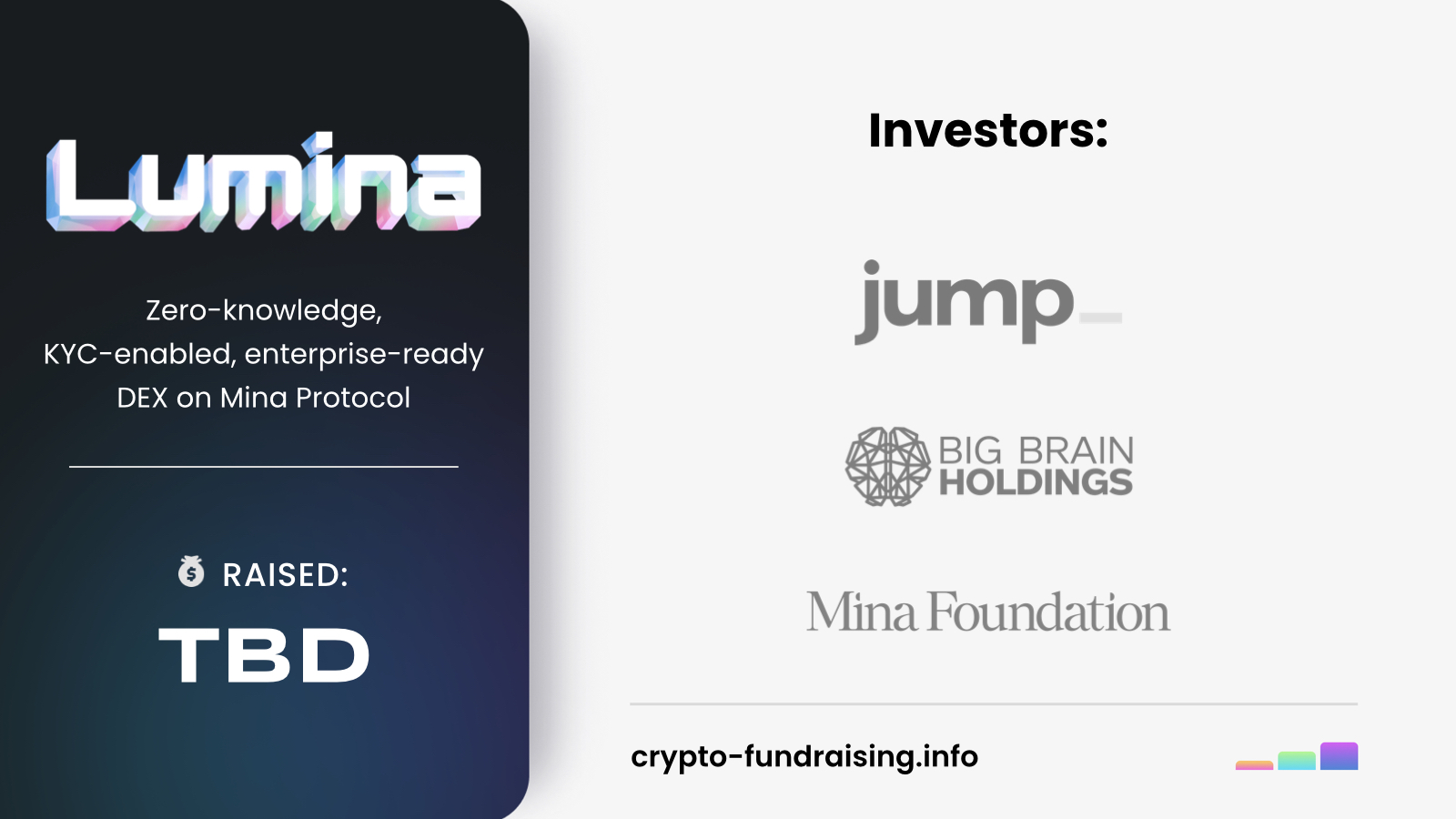 Zero-knowledge, KYC-enabled, enterprise-ready DEX on Mina Protocol Lumina closed Strategic funding round from Mina Protocol, Big Brain Holdings, Jump Crypto.