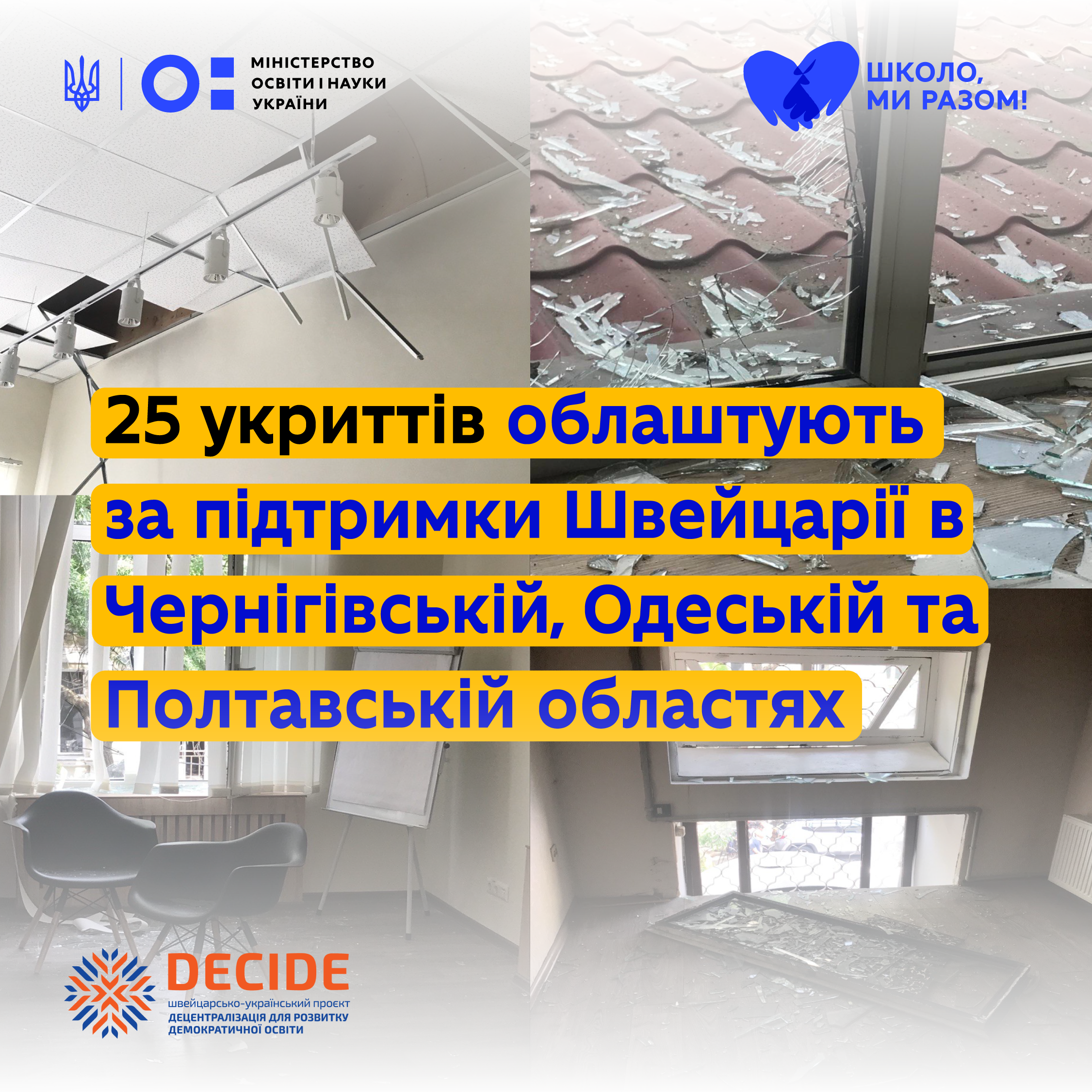 На ініціативу швейцарсько-українського проєкту DECIDE з відбудови шкіл в Україні, зруйнованих під час війни, додатково виділили 4,3 млн швейцарських франків (приблизно 170 млн грн), які згодом підуть на облаштування укриттів у 25 школах Чернігівщини, Одещини й Полтавщини. А отже, ще більше дітей тепер матимуть безпечні умови для навчання! 🙌
