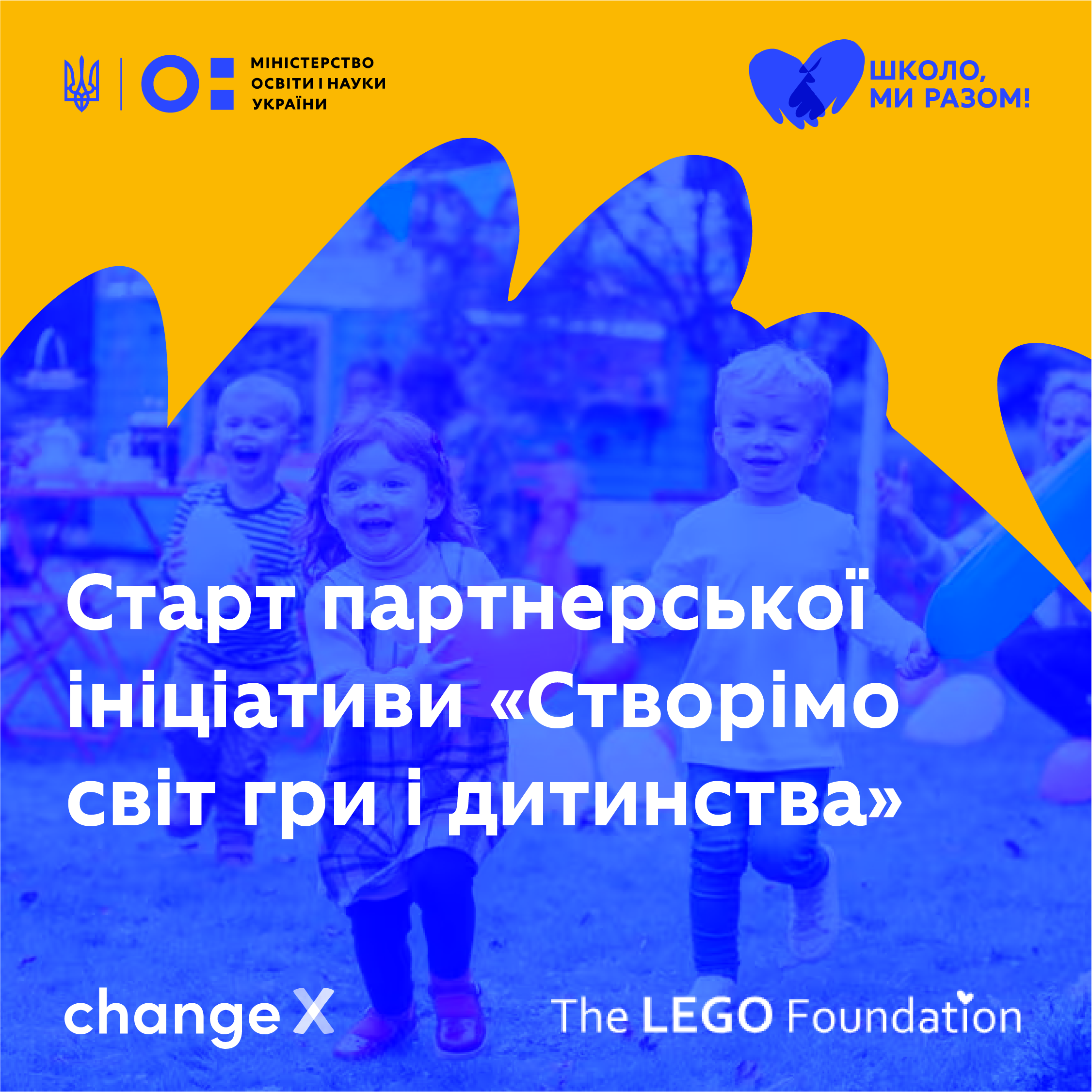 ChangeX та the LEGO Foundation долучилися до ініціативи МОН з відновлення освітнього процесу «Школо, ми разом!», щоб забезпечити комфортні умови для навчання, надихнути дорослих зробити дитинство дітей яскравішим і створити можливості для гри в різних куточках України. Минулого року партнерські ініціативи «Створімо світ гри і дитинства» успішно реалізували у США, Великій Британії, Бразилії, Ірландії та ще п’яти країнах світу, а тепер така можливість з’явилася і для України!