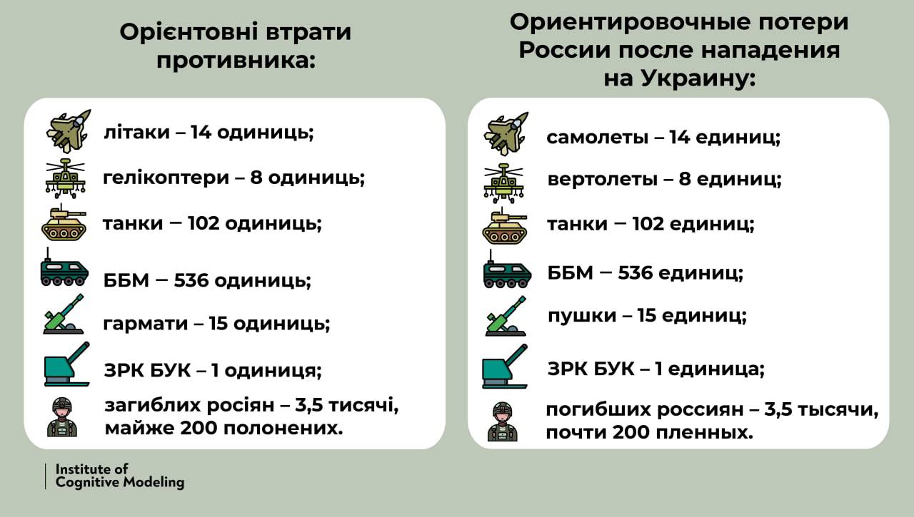 Враг начал передислокацию резервных подразделений в приграничные с Украиной районы и продолжает наносить авиационные удары по аэродромам, группировкам войск ВС Украины на Востоке и в северной части Киевской области. Осуществлены одиночные авиационные удары в Сумах, Полтаве и Мариуполе. С Черного моря враг совершил пуск крылатых ракет морского базирования Калибр по территории Украины.