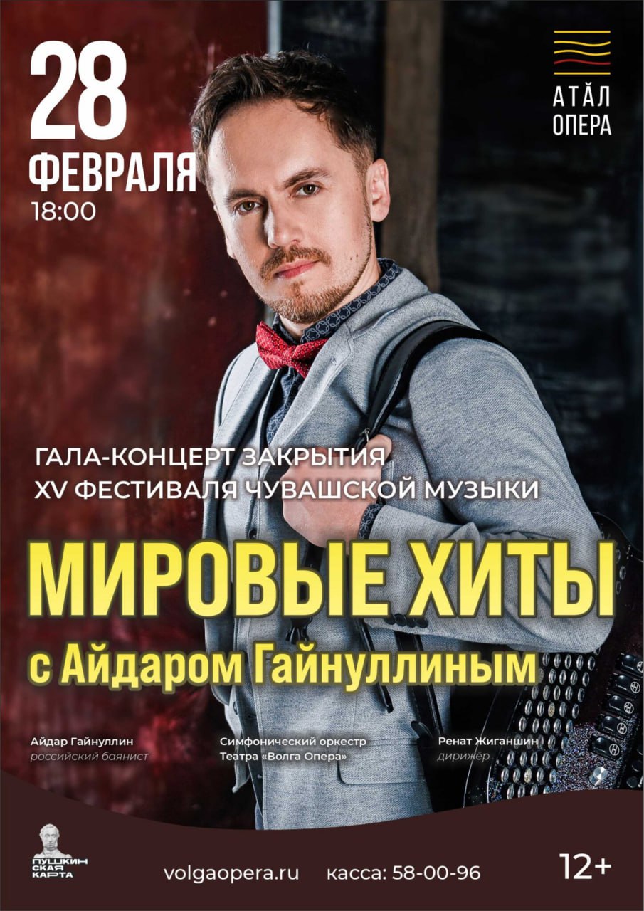 Хиты, объединяющие эпохи и жанры, в виртуозном исполнении мастера баяна, симфонического оркестра и хора театра «Волга Опера» (дирижер — Ренат Жиганшин)