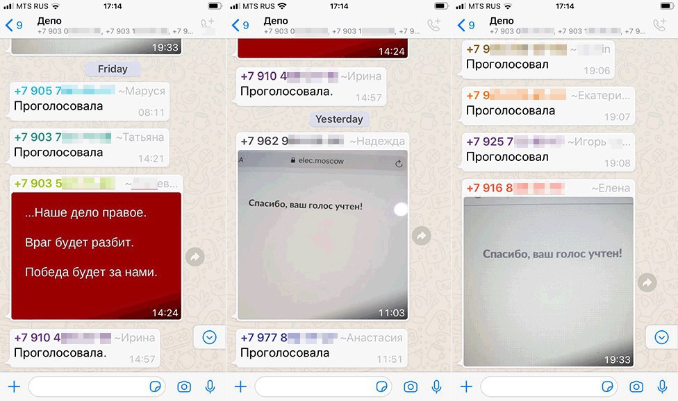 Журналист утверждает, что в 2018 году Би-би-си предоставила ему служебную SIM-карту МТС «с историей» — ранее номер принадлежал главе первичной профсоюзной организации электродепо «Свиблово». В августе 2019 года принадлежащий корреспонденту номер добавили в чат в WhatsApp под названием «Депо» примерно на 50 человек. 23 июня 2020 года, за два дня до начала голосования, администратор чата попросил участников отписаться, где они будут голосовать. После завершения «переклички» один из пользователей написал: «Отчет 25.06!» В эту дату участники чата начали отписываться о том, что проголосовали. Один из них запостил картинку со следующей фразой: «Наше дело правое. Враг будет разбит. Победа будет за нами».