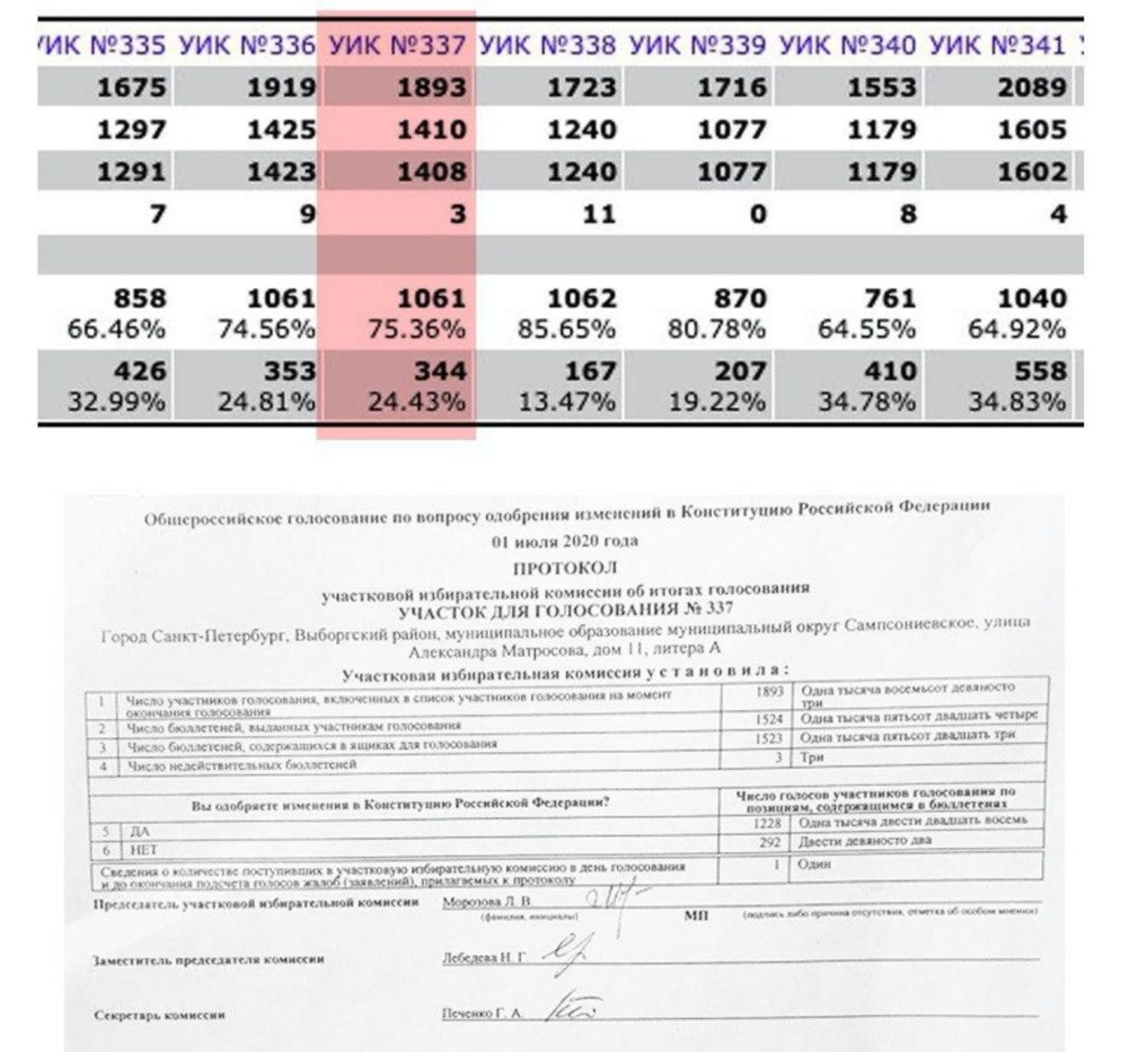 На участке № 337, согласно протоколу участковой комиссии, проголосовали 1524 человека, из них «да» поправкам сказали 1228 человек, а «нет» — 292. Таким образом, одобрили обнуление 80,5% избирателей, отвергли его — 19,1%. В ГАС «Выборы» должны были появиться данные из составленного участковой комиссией протокола, однако там почему-то оказались другие данные. По состоянию на утро 3 июля в базе данных Центризбиркома значилось, что на участке № 337 проголосовали только 1410 человек, из них за поправки высказались 75,36% избирателей (1061 человек), а против — 24,43% (344 человека).