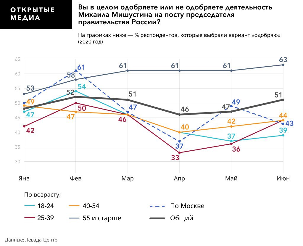 В июне молодые люди от 18 до 24 лет стали ещё меньше одобрять действия премьера: положительно оценили его деятельность уже 39% респондентов. В целом за полгода рейтинг одобрения Мишустина упал с 49% до 44% среди граждан от 40 до 54 лет и с 47% до 39% — у молодежи. Зато повысился в старшей возрастной группе: с 53% до 63% среди тех, кто старше 55 лет.
