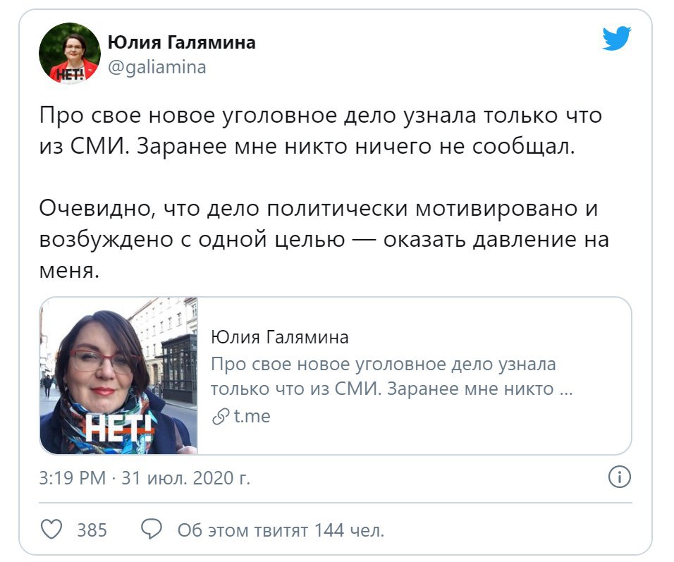 Галямина, комментируя дело в своём Twitter, назвала его политически мотивированным и выразила мнение, что оно заведено, чтобы оказать на неё давление.