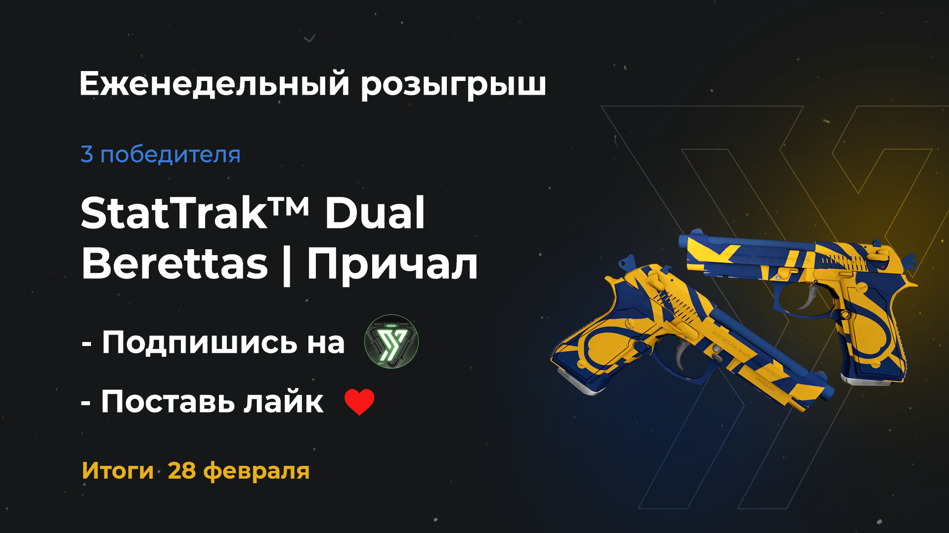 🎁 StatTrak Dual Berettas | Причал (немного поношенное) 3 победителя, по одному стволу в руки! — Лайк под 👉🏻 этой записью — Подписка 👉🏻 Уголок Трейдера 🗓 Итоги: 28 февраля