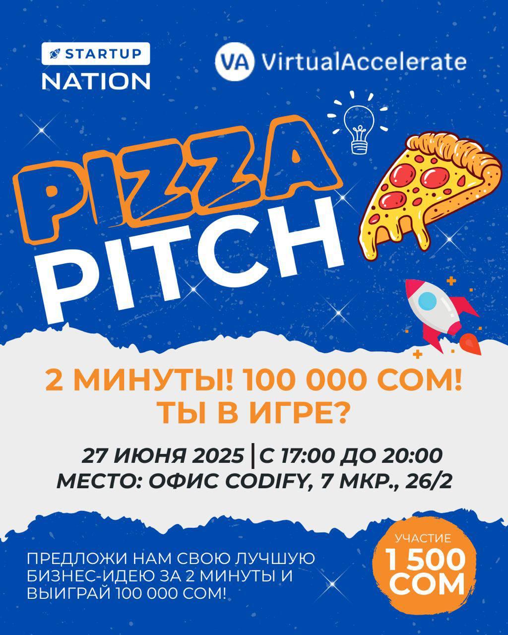 27 июня в офисе Codify c 17:00 до 20:00 в рамках подготовки к хакатону Startup Nation совместно с Virtual Accelerate пройдет серия коротких питчей с пиццей для фаундеров с возможностью выиграть 100 000 сомов за лучший питч.