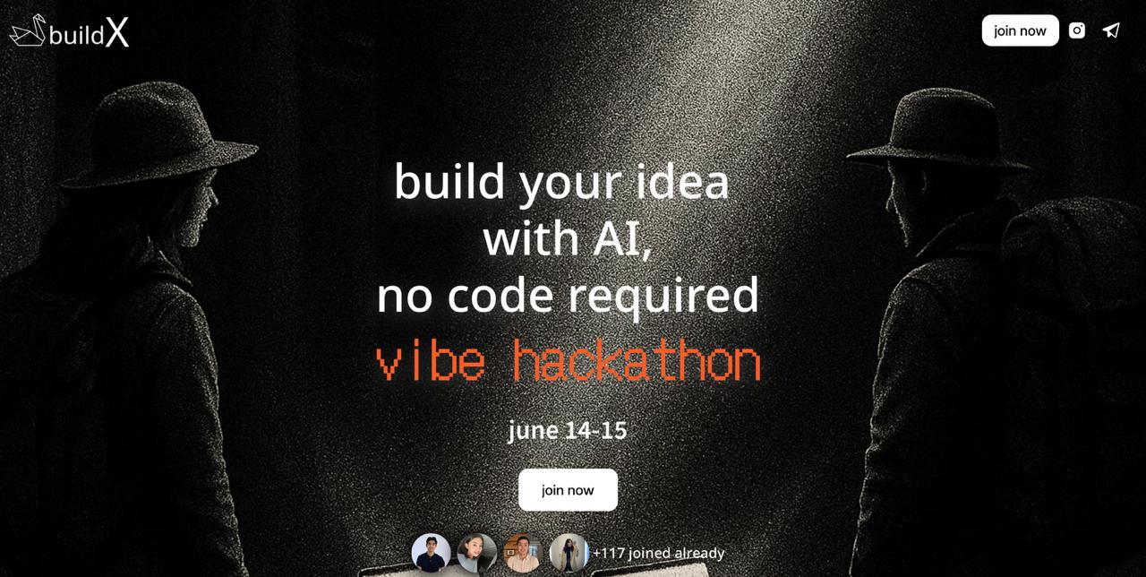buildX приглашает принять участие в хакатоне vibe hackathon 14-15 июня, который поможет воплотить свои идеи в жизнь с помощью AI. 24-часовой хакатон подразумевает создание продуктов, в которых все, включая код, дизайн, маркетинг и даже видео создается с помощью AI-инструментов без ручного написания кода или ручных съемок.
