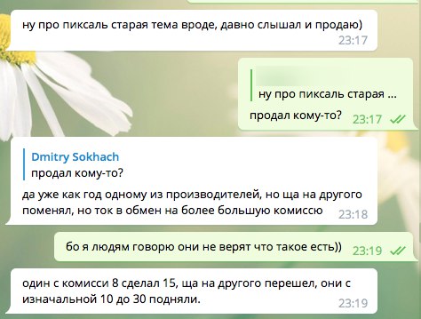 Один из подписчиков согласился поделиться своими результатами: пиксель он не продает, вместо этого договорился сначала с одним производителем о повышении процента с 8 до 15%, а недавно перешел на другого производителя, который платит за пиксель 30%-ой повышенной комиссией.